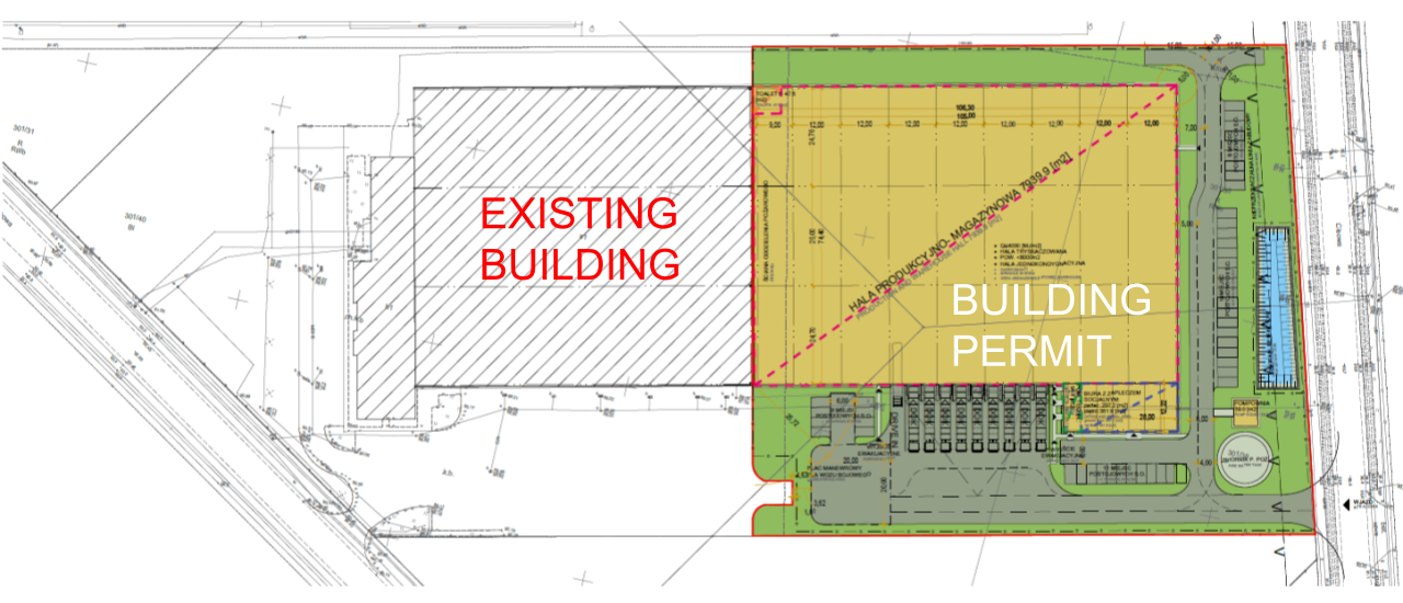 • niezabudowana działka odpowiednia do składowania zewnętrznego i/lub rozbudowy istniejącego budynku (wydane pozwolenie na budowę obiektu logistycznego o powierzchni 8.350 m²)